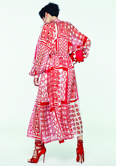 에스닉한 느낌을 자아내는 레드 컬러 패턴 롱 드레스 4백69만원 펜디. 레드 스트랩 힐 가격 미정 쥬세페 자노티.드롭 형태의 진주 이어링 16만8천원 엠주. |