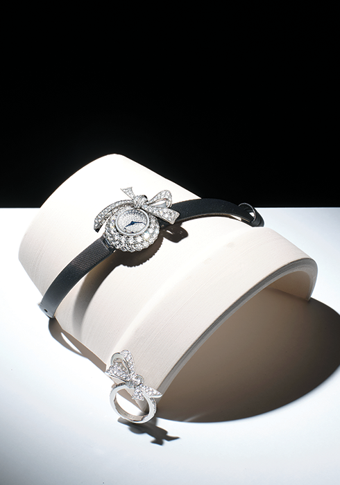 (위부터) 화이트 골드에 다이아몬드 총 5.77캐럿을 세팅해 우아함을 부여한 틸다의 보우 다이아몬드 워치 9천5백64만원, 화이트 골드 소재 리본 디자인에 총 2.1캐럿 다이아몬드를 세팅해 볼륨감과 화려함을 갖춘 그라프 틸다의 보우 컬렉션 라운드 다이아몬드 링 2천3백53만원 모두 그라프. 문의 02-2150-2320 |