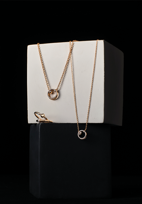 (왼쪽 아래부터 차례대로) 밴드 중앙을 3개의 화이트 다이아몬드로 장식한 로즈 골드 소재의 투게더 링, 로즈 골드 소재 밴드에 9개의 화이트 다이아몬드를 루치올레 세팅한 투게더 링, 로즈 골드 링에 52개의 화이트 다이아몬드를 세팅해 우아한 느낌을 부여한 투게더 네크리스, 보다 작은 사이즈로 레이어링하기 좋은, 로즈 골드 소재에 36개 다이아몬드를 세팅한 투게더 네크리스 미니 펜던트 모두 가격 미정 포멜라토. 문의 02-3143-9486 |