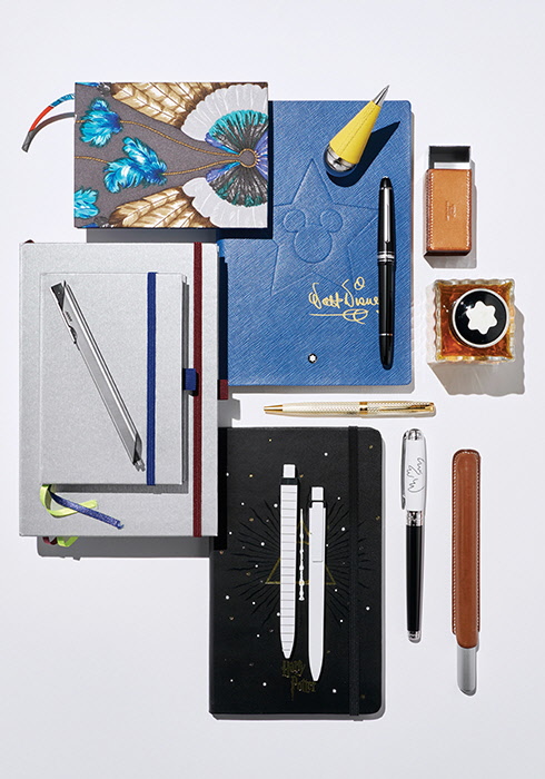 화려하고 이국적인 프린트의 실크 커버 노트 10만원대, 한 손에 쏙 들어오는 앙증맞은 크기로 아무렇게나 놓아도 오뚝이처럼 귀엽게 일어선다. 옐로 컬러 바레니아 소가죽을 매치한 펜 1백만원대. 모두 에르메스. 미키마우스 얼굴을 엠보싱 처리하고 월트 디즈니의 서명을 프린트한 사피아노 레더 소재 GC 월트 디즈니 노트 #146. 내부는 실버 컷 테두리와 골드 컬러 북마크로 완성했다. 12만원, 마이스터스튁 플래티넘 코팅 만년필 74만원 모두 몽블랑. 메탈에 바레니아 소가죽을 매치한 펜 잉크 카트리지 케이스 40만원대 에르메스. 50ml 병 잉크 4만9천원 몽블랑. 소네트 푸제르 실버 GT 볼펜 45만원 파카. 사용할수록 손때가 묻으며 더욱 멋스러워지는 소가죽 펜 케이스 50만원대, 알루미늄 펜 1백50만원대 모두 에르메스. 평화의 비둘기(The Dove of Peace) 컬렉션에 파블로 피카소의 이미지를 더했다. 리미티드 에디션으로 출시한 피카소 도브 만년필 3백29만원 에스.티. 듀퐁 파리. 해리포터 한정판 노트 3만9천6백원, 사각형 클릭 볼펜 각 9천9백원 모두 몰스킨. 잉크 번짐이나 비침이 적은 하드커버 노트. 노트에 펜을 고정할 수 있는 펜루프, 명함이나 영수증을 보관할 수 있는 메모 포켓을 장착했다. A5 사이즈 오션블루 3만4천원, A6 사이즈 다크 퍼플 2만8천원, 독일 디자이너 리차드 쉐퍼가 디자인한 삼각형 보디가 특징인 다이얼로그 1 무광 티타늄 볼펜 35만원 모두 라미.