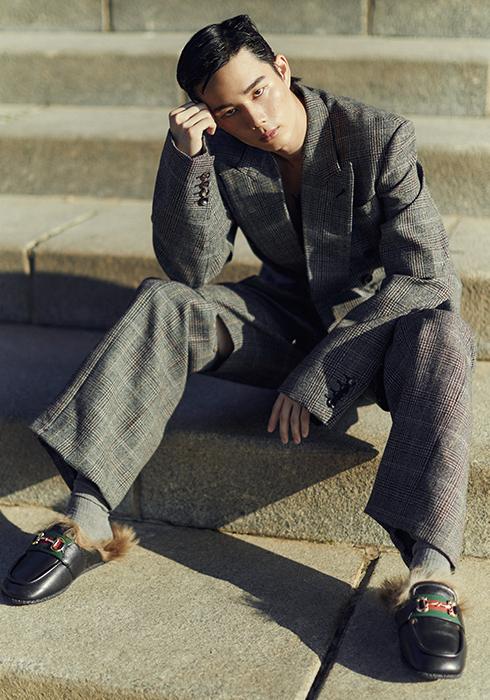 울 소재의 그레이 컬러 더블브레스트 재킷 5백90만원, 울 소재의 그레이 컬러 와이드 팬츠 3백70만원, 레더 소재의 러버 솔 뮬 가격 미정 모두 구찌.
