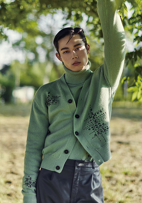 니트 & 레더 소재의 아쿠아리움 컬러 카디건, 니트 & 레더 소재의 아쿠아리움 컬러 터틀넥, 카프 스킨 소재의 앤트러사이트 컬러 팬츠 모두 가격 미정 에르메스.