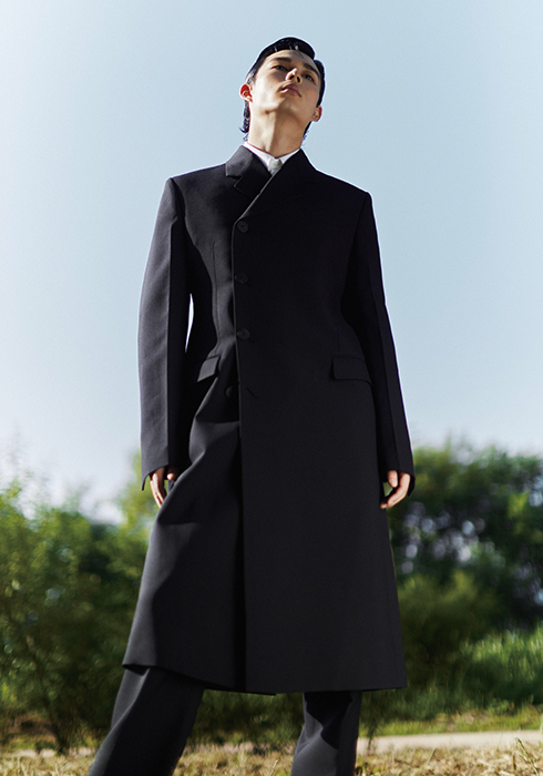 블랙 컬러의 사이드 버튼 디테일 코트, 화이트 컬러의 히든 버튼 셔츠, 블랙 컬러의 테일러드 팬츠 모두 가격 미정 페라가모.
