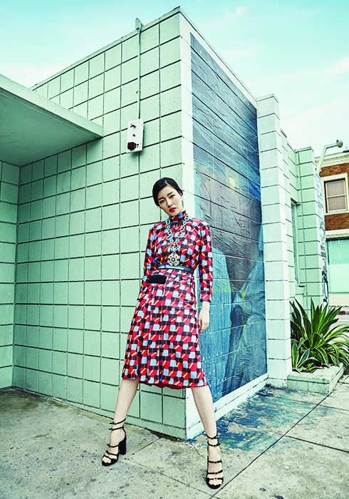 기하학적 패턴의 드레스 가격 미정, 볼드한 네크리스 2백만원대, 벨트 30만원대 모두 프라다. 스트랩 힐 1백60만원 지암바티스타 발리.