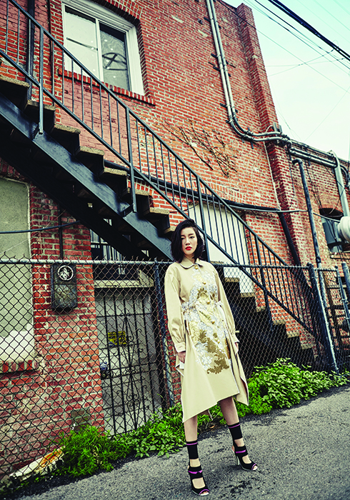 베이지와 골드 컬러의 프린트가 고급스러운 무드를 자아내는 트렌치코트 1천1백18만원, 블랙 니트 스트랩 힐 1백62만원 모두 펜디.