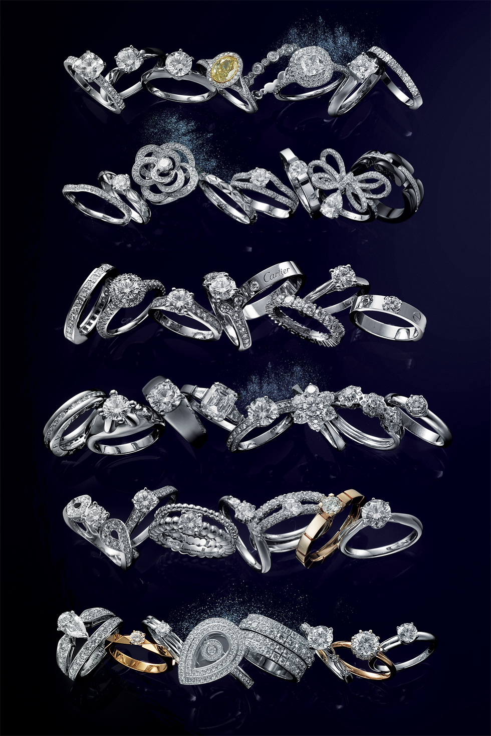 1.8캐럿 다이아몬드를 세팅한 웨딩 밴드 1천만원대, 0.71캐럿의 센터 스톤을 원형 비즈 세팅으로 볼륨을 더한 데스티네 솔리테어 링 2천만원대, 다이아몬드 밴드에 0.71캐럿 스톤을 세팅한 솔리테어 1895 파베 링 2천5백만원대, 1.04캐럿 다이아몬드가 감싸고 있는 발레린 링 4천4백만원대, 브랜드 로고와 작은 다이아몬드를 매치한 인그레이브드 웨딩 링 3백80만원대, 총 1.5캐럿 다이아몬드를 세팅한 웨딩 밴드 1천3백만원대, 4개의 프롱으로 0.74캐럿 다이아몬드를 세팅한 솔리테어 1895링 1천4백만원대, 러브 링에 0.25캐럿 다이아몬드를 세팅한 러브 솔리테어 링 4백70만원대 모두 까르띠에.