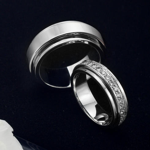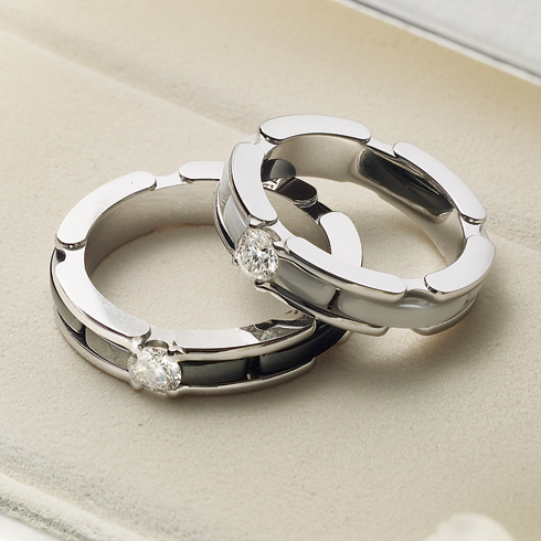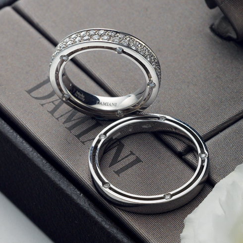 다미아니 디사이드 컬렉션 사이드에 숨겨져 있는 다이아몬드가 아름다운 클래식한 커플 링. 다이아몬드의 개수에 따라 가격이 달라진다. 풀 파베 링 9백만원대, 화이트 골드 링 2백만원대.