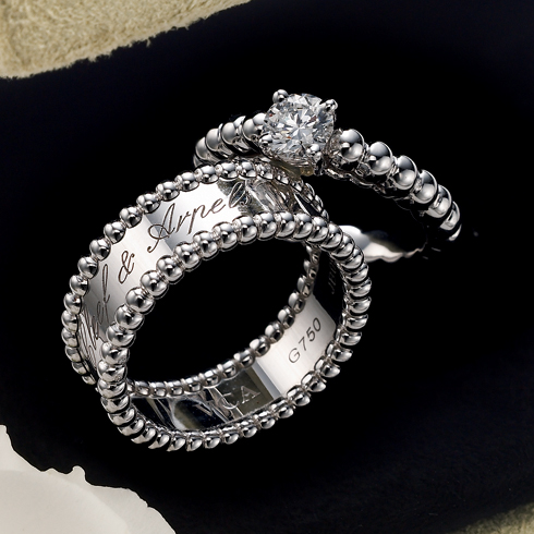 반클리프 아펠 뻬를리 컬렉션 정교한 비즈 장식 모티브로 남성과 여성 모두에게 우아함을 선사하는 디자인. 다이아몬드 세팅 솔리테어 링 1천만원대, 브랜드 로고가 새겨진 밴드 링 3백만원대.