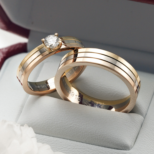 까르띠에 트리트니 컬렉션 옐로 골드, 화이트 골드, 핑크 골드 등 세 가지 컬러의 하모니로 완성한 웨딩 밴드 2백만원대, 0.23캐럿 다이아몬드를 세팅한 솔리테어 링 4백80만원대.