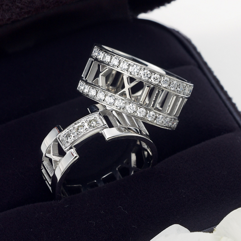 티파니 아틀라스 컬렉션 티파니 뉴욕 본사 건물 외벽 시계의 로마숫자에서 모티브를 얻은 대표적인 컬렉션. 밴드 사이드에 다이아몬드를 세팅한 아틀라스 오픈 다이아몬드 링 5백만원대, 가운데 브리지 부분에만 다이아몬드를 세팅한 아틀라스 오픈 3-다이아몬드 링 2백만원대.
