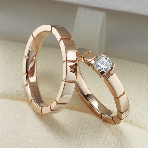 타사키 피아노 컬렉션 타사키 고유의 18K 사쿠라 골드를 소재로 밴드를 마치 피아노 건반처럼 디자인한 유니크한 컬렉션. 다이아몬드를 세팅한 여성용 솔리테어 링 6백만원대, 남성용 밴드 링 1백60만원대.