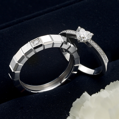 쇼파드 웨딩 컬렉션 얼음 조각에서 영감을 받은 큐브로 이루어진 아이스 큐브 밴드 링 2백만원대, 사랑스러운 신부를 더욱 돋보이게 할 0.5캐럿 하트 컷 다이아몬드 솔리테어 링 1천만원대.