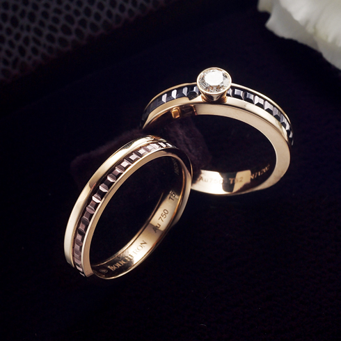 부쉐론 쿼트르 컬렉션 초콜릿 컬러의 골드로 정교하게 완성한 브랜드의 시그너처 컬렉션. 다이아몬드를 세팅한 여성용 솔리테어 다이아몬드 링 8백만원대, 심플한 디자인의 남성용 밴드 2백만원대.