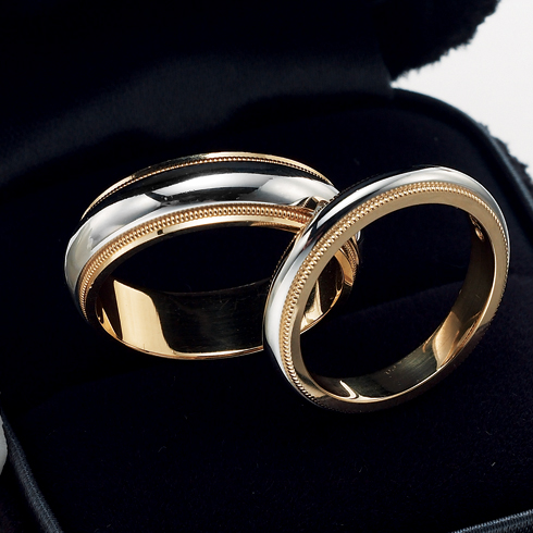 티파니 밀그레인 컬렉션 심플하지만 오래도록 사랑받고 있는 티파니의 스테디셀러 밀그레인 커플 링. 플리태넘에 옐로 골드를 매치한 디자인으로 두께 6mm 밴드 링은 3백만원대, 3mm 밴드 링은 1백만원대.