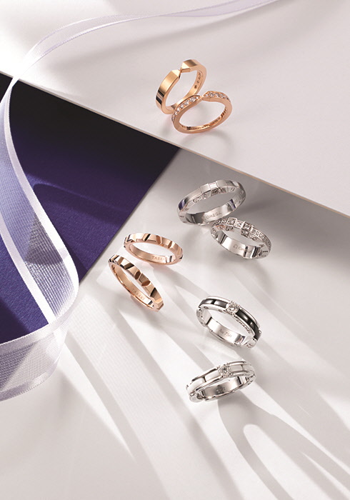 프랑스어로 날개를 뜻하는 쁠륌(Plume) 컬렉션의 웨딩 밴드. 새의 날개가 맞닿아 있듯 서로 이어진 연인의 마음을 형상화한 디자인이 특징으로, 핑크 골드 밴드와 브릴리언트 컷 다이아몬드를 세팅한 밴드 모두 가격 미정 쇼메. 워치 컬렉션에서 모티브를 가져온 타임리스한 디자인이 돋보이는 컨스텔레이션 웨딩 밴드. 단면에 인그레이빙 장식을 더한 화이트 골드 컨스텔레이션 링 1백95만원, 총 0.48캐럿에 달하는 50개의 다이아몬드를 세팅한 컨스텔레이션 링 4백50만원 모두 오메가. 입체적이고 기하학적인 형태로 눈길을 끄는 사쿠라골드 소재 트라페지오 웨딩 밴드 모두 가격 미정 타사키. 그래픽적인 울트라 모티브의 화이트 골드 밴드에 센터 스톤을 장식한 커플 링. 각각 블랙과 화이트 세라믹을 적용한 것으로 각 5백40만원 샤넬.