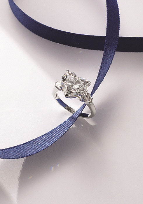 중앙의 4.02캐럿 하트 셰이프 다이아몬드와 사이드 스톤을 나란히 세팅해 눈부시게 빛나는 프로미스 링 가격 미정 그라프.