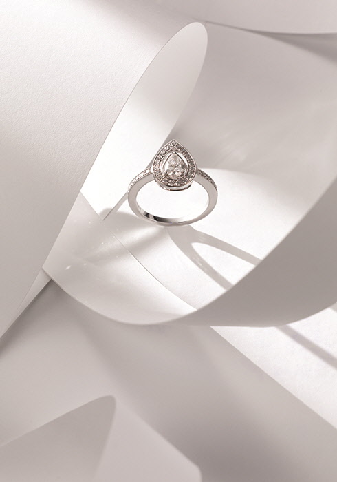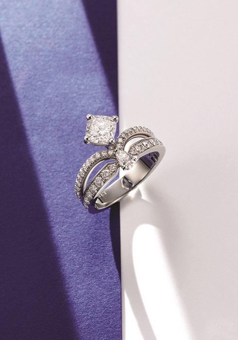 1캐럿의 페어 컷 다이아몬드를 센터 스톤으로 장식한 러브라이트 인게이지먼트 링 1천만원대 프레드.