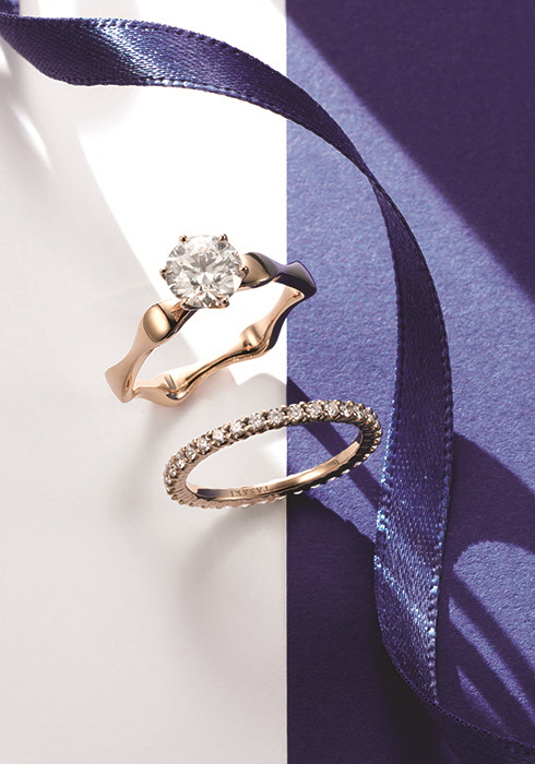 부드러운 곡션형 사쿠라골드 밴드가 아름다운 라벨로 솔리테어 링, 가드 링으로 함께 제안하는 브릴란테 트리프로 링 모두 가격 미정 타사키.
