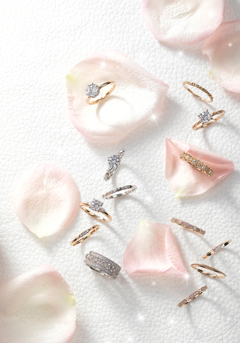 장미의 줄기와 잎에서 영감을 받아 밴드에 섬세하게 작은 잎 모양을 새긴 피유 핑크 골드 밴드 링 40만원대. 섬세한 장미의 줄기와 잎, 꽃봉오리같이 섬세하게 세팅한 다이아몬드가 매력적인 피유 핑크 골드 솔리테어 링 1캐럿 기준 2천만원대. 밀그레인 기법으로 장미 꽃잎을 섬세하게 표현한 페탈 로즈 골드 다이아몬드 링 1백60만원대. 아름다운 레이스의 프릴에서 영감을 받은 디자인으로 화이트 다이아몬드와 핑크 사파이어를 세팅한 코르렛트 핑크 골드 밴드 링 2백만원대. 프랑스의 눈부신 장미 궁전을 표현한 클래식한 디자인의 팔레 다이아몬드 링 1백30만원대. 두 사람이 함께 앞으로 피워나갈 많은 꽃봉오리들을 밀그레인 기법의 금속 볼로 표현한 브루종 핑크 골드 밴드 링 50만원대. 종루와 그 안에 비치된 카리용 악기에서 모티브를 얻었으며 섬세한 세공이 돋보이는 클로쉐 핑크 골드 밴드 링 1백20만원대 모두 루시에.