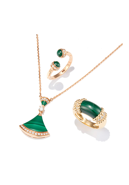 불가리 디바스 드림 로즈 골드에 말라카이트 장식과 다이아몬드 파베 세팅으로 아이코닉한 부채꼴의 유려한 곡선을 더욱 우아하게 완성한 펜던트 네크리스 6백만원대. 문의 02-2056-0170 피아제 포제션 말라카이트 오픈 링 브랜드의 아이코닉한 포제션 라인의 오픈 링으로 18K 핑크 골드 밴드의 회전 모티브에 총 0.2캐럿, 20개 다이아몬드를 더하고 끝에 2개의 말라카이트 약 0.79캐럿을 세팅한 링 4백44만원. 문의 1668-1874 반클리프 아펠 뻬를리 컬러 링 이번에 새롭게 출시한 뻬를리 라인의 18K 옐로 골드 링으로, 다이아몬드와 중앙에 말라카이트 원석을 배치해 시선을 사로잡는다. 1천만원대. 문의 1877-4128