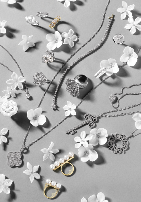 행운의 아이콘인 알함브라 펜던트에 다이아몬드를 파베 세팅한 매직 알함브라 롱 네크리스 3천1백만원대 반클리프 아펠. 단아하고 여성스러운 동백꽃 한송이를 표현한 0.09캐럿 까멜리아 화이트 골드 링. 6백만원대 샤넬 화인 주얼리. 우아한 라운드 컷 다이아몬드 펜던트의 코로나 네크리스 1캐럿 기준 3천만원대 불가리. 깃털 모티브를 정교하게 세공한 화이트 골드 플룸 링 1천만원대, 유성 모티브를 5개의 진주와 45개의 라운드 컷 다이아몬드로 완성한 꼬메뜨 에뚜알 뻬흘레 링 1천4백만원대 모두 샤넬 화인 주얼리. 12mm 남양진주와 0.5캐럿 다이아몬드를 18K 화이트 골드 직선 바 위에 세팅한 밸런스 클래스 링 2천2백만원대 타사키. 장미꽃잎을 형상화한 페탈 링 2백30만원대 루시에. 다이아몬드를 세팅한 밴드를 X자 옐로 골드 모티브가 감싸고 있는 디자인이 유니크한 식스틴 스톤 링 1천5백만원대, 마키즈 컷 다이아몬드로 꽃잎을 표현한 빅토리아 라인 브레이슬릿 3천만원대 모두 티파니. 서약의 자물쇠를 연상케 하는 독특한 디자인의 다이아몬드 파베 세팅 아뮬레뜨 드 까르띠에 링 1천3백만원대 까르띠에. 입체감 있게 디자인한 화이트 세라믹 & 다이아몬드 버전의 울트라 링 4백만원대 샤넬 화인 주얼리. 손을 움직일 때마다 찰랑거리는 화려한 화이트 골드 볼이 매력적인 파리 누벨바그 컬렉션 링 1천2백만원대 까르띠에. 가장자리에 화이트 골드 볼을 세팅한 물방울 모양의 다이아몬드 펜던트가 포인트인 쎄뻥 화이트 골드 브레이슬릿 6백만원대 부쉐론. 하트 셰이프로 이루어진 인챈트 하트 키 펜던트 1천7백만원대, 아름다운 곡선으로 화려한 펜던트를 완성한 인챈트 스크롤 펜던트 네크리스 1천8백만원대 모두 티파니. 최상급 아코야 진주 5개를 18K 옐로 골드 바 위에 세팅한 화려하고 대담한 디자인이 눈길을 사로잡는 밸런스 시그너처 링 3백10만원대, 18K 옐로 골드에 최상급 아코야 진주 3개를 일렬로 세팅한 우아한 스타일의 밸런스 에라 링 2백40만원대 모두 타사키.