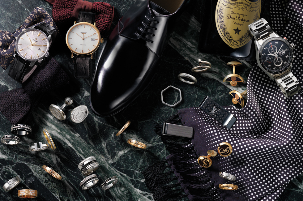 풍요, 지혜, 불멸과 장수를 상징하는 뱀에게서 영감을 받은 세르펜티 핑크 골드 웨딩 밴드 1백만원대, 불가리를 상징하는 웨딩 밴드로, 인그레이빙한 더블 로고 중앙에 다이아몬드를 장식한 불가리 불가리 화이트 골드 웨딩 밴드 2백만원대 모두 불가리. 브레게를 상징하는 알파벳 ‘B’ 로고가 시선을 사로잡는 9903BR 커프스 링크 6백만원대 브레게. 감각적인 지그재그 패턴을 인그레이빙한 쉐브론 라인 데코 머니 클립 30만원대 까르띠에. 부드러운 곡선 디자인이 유니크한 라벨로 화이트 골드 밴드 링 2백50만원대 타사키. 플래티넘 밴드 중앙에 세팅한 솔로 다이아몬드와 밴드 측면에 인그레이빙한 이탤릭체의 반클리프 아펠 로고가 포인트인 뉴욕 밴드 링 4백만원대 반클리프 아펠. 단순하고 평범한 못에서 모티브를 얻어 독특한 아름다움을 선사하는 저스트 앵 끌루 링 2백90만원대 까르띠에. LV 로고 장식의 머니 클립 30만원대 루이 비통. 시계의 문페이즈를 형상화한 커프스 링크 3백79만원 블랑팡. 타키미터 스케일을 표시한 현대적인 세라믹 베젤, H자 모양의 스틸 브레이슬릿, 빈티지 카운터에서 영감을 받은 아라비아숫자 인덱스와 날짜창이 특징인 43mm 까레라 칼리버 1887 크로노그래프 5백만원대 태그호이어.