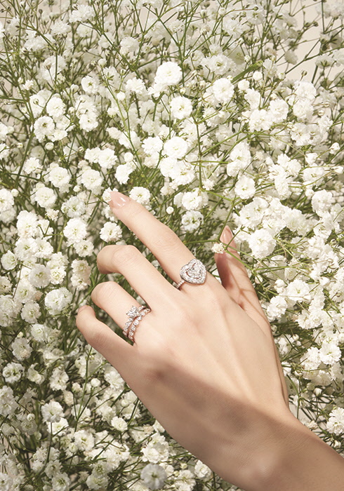 하트 컷 화이트 다이아몬드 1캐럿과 브릴리언트 컷 화이트 다이아몬드 12개로 이뤄진 링으로 안쪽에 포인트 루비 장식을 더한 프리티 우먼 아이코닉 인게이지먼트 링 가격 미정, 하트 반쪽 장식에 브릴리언트 컷 다이아몬드가 세팅되어 있고 안쪽에는 루비를 세팅한 싱글 밴드 링으로 프리티 우먼 아이코닉 인게이지먼트 링과 매치하면 완전한 하트 모양의 밴드 디자인이 완성되는 프리티 우먼 웨딩 링 4백66만원, 가운데 사랑에 대한 프레드 사무엘의 찬사를 담은 2캐럿의 큰 하트 컷 다이아몬드를 중심으로 주변에 78개의 브릴리언트 컷 화이트 다이아몬드를 더해 화려함과 우아함을 극대화한 프리티 우먼 인게이지먼트 링 가격 미정 모두 프레드. 문의 02-514-3721