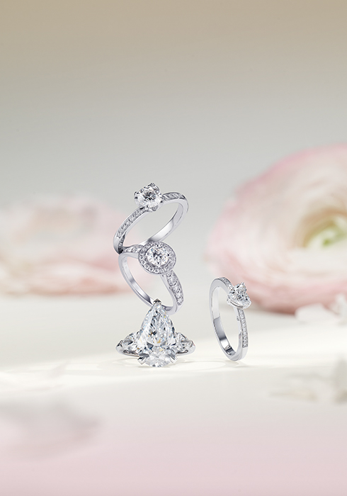 (위부터 차례대로) 총 0.7캐럿의 브릴리언트 컷 다이아몬드로 완성하고, 플래티넘 소재의 밴드에 다이아몬드를 파베 세팅한 델핀 인게이지먼트 링 1천5백38만원 프레드. 메종만의 특허 기술을 적용한 K88 컷의 0.51캐럿 다이아몬드를 중앙에 세팅한 18K 화이트 골드 소재의 브라이덜 링 가격 미정 콜로프. 대범한 실루엣을 자랑하는 총 5.08캐럿의 페어 컷 다이아몬드를 세팅한 프로미스 링 가격 미정 그라프. 화이트 골드 밴드에 하트 셰이프 다이아몬드를 세팅해 사랑스러운 느낌을 자아내는 프러포즈 링 1천1백56만원 쇼파드.