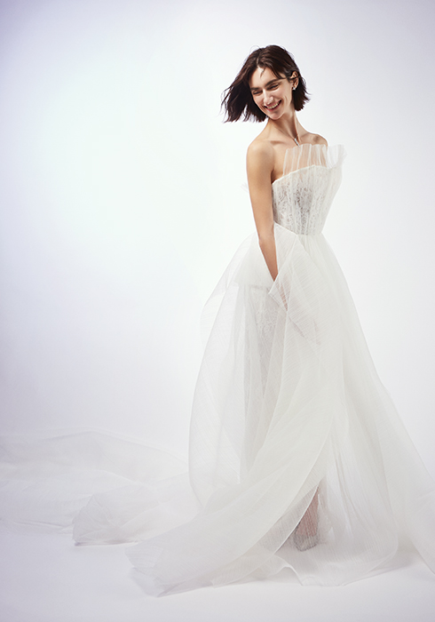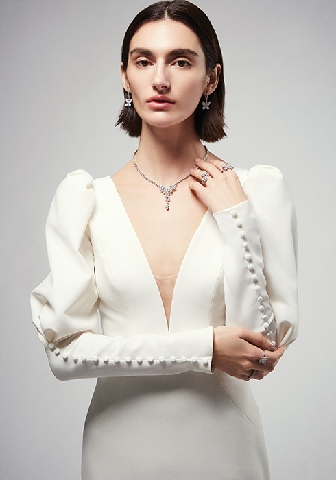 풍성한 숄더 디테일이 돋보이는 도비 실크 소재의 슬림 드레스 가격 미정 프로노비아스 by 핑크공브라이드. (위부터) 아이코닉한 버터플라이 디자인에 총 1.43캐럿의 다이아몬드로 완성해 우아함을 부여한 이어링 1천7백46만원, 총 17.14캐럿의 다이아몬드를 교차 세팅해 화려함을 부각한 클래식 버터플라이 컬렉션 멀티 셰이프 다이아몬드 네크리스 가격 미정, 총 1.15캐럿의 다이아몬드로 화려한 나비를 형상화한 파베 버터플라이 컬렉션 마키즈 다이아몬드 링 1천8백98만원 모두 그라프. 사랑의 약속을 상징하는 플라워 디자인의 18K 화이트 골드 보디에 75개의 브릴리언트 컷 다이아몬드 약 0.62캐럿을 세팅해 화려하게 장식한 로즈 인게이지먼트 링 1천4백90만원 피아제. 화이트 골드에 다이아몬드를 파베 세팅해 화려한 나비의 모습을 표현한 버터플라이 실루엣 컬렉션 링 9백87만원, 총 2.13캐럿의 라운드 컷 다이아몬로 모던하면서도 우아한 감성을 부여한 이터니티 링 1천7백46만원 모두 그라프.