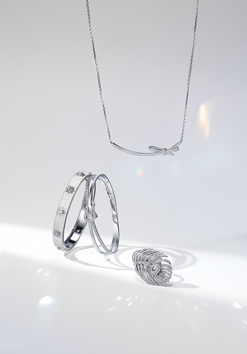 (왼쪽부터 차례대로) 메종만의 아이코닉한 인그레이빙 기법이 돋보이는 표면이 특징으로, 총 0.5캐럿의 다이아몬드를 세팅한 화이트 골드 소재 마크리 클래시카 브레이슬릿 1천9백만원대 부첼라티. 총 1백19개의 브릴리언트 컷 다이아몬드를 촘촘하게 세팅해 눈부신 광채를 자랑하는 화이트 골드 소재의 샹스 인피니 뱅글 2천1백40만원 프레드. 우아한 리본 포인트가 여성스러운 무드를 부여하는 동시에 심플한 실루엣을 이루는 총 0.6캐럿의 브릴리언트 컷 다이아몬드 세팅 루반 네크리스 1천4백만원대 샤넬 화인 주얼리. 우아한 무드를 선사하는 공작 깃털에서 영감받아 탄생했으며, 0.51캐럿의 1개 다이아몬드와 총 1.95캐럿의 3백14개 라운드 컷 다이아몬드를 세팅한 플륌 드 펑 라지 링 6천만원대 부쉐론.