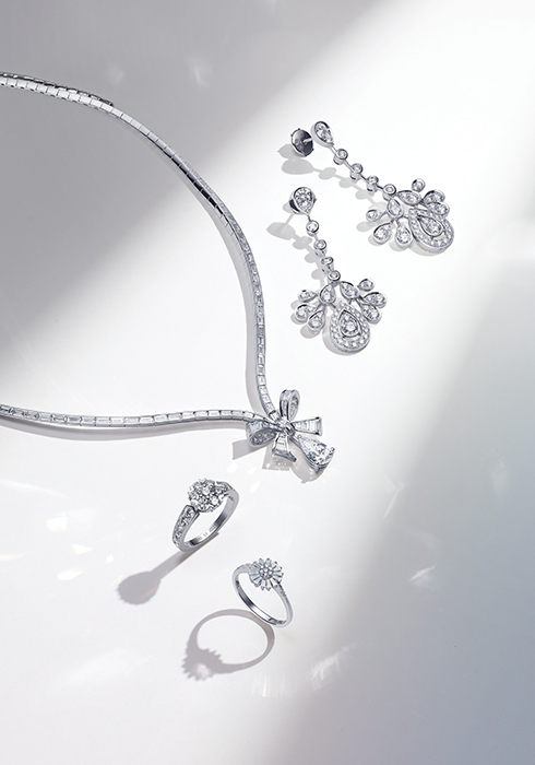 (위부터 차례대로) 화려하면서도 여성스러운 디자인이 특징이며, 총 4.42캐럿의 84개 다이아몬드를 세팅한 조세핀 아그레뜨 임페리얼 이어링 5천만원대 쇼메. 총 10.71캐럿의 다이아몬드를 세팅하고 리본 디자인을 더해 사랑스러운 무드의 틸다의 보우 컬렉션 멀티 셰이프 다이아몬드 네크리스 가격 미정 그라프. 단아한 멋을 전하는 총 1.23캐럿의 17개 라운드 컷 다이아몬드를 세팅한 화이트 골드 소재의 플로레뜨 링 2천만원대 반클리프 아펠. 총 0.33캐럿의 23개 다이아몬드를 세팅했으며, 심플한 분위기를 전해 매일 착용하기에 제격인 르미에 링 4백만원대 콜로프.