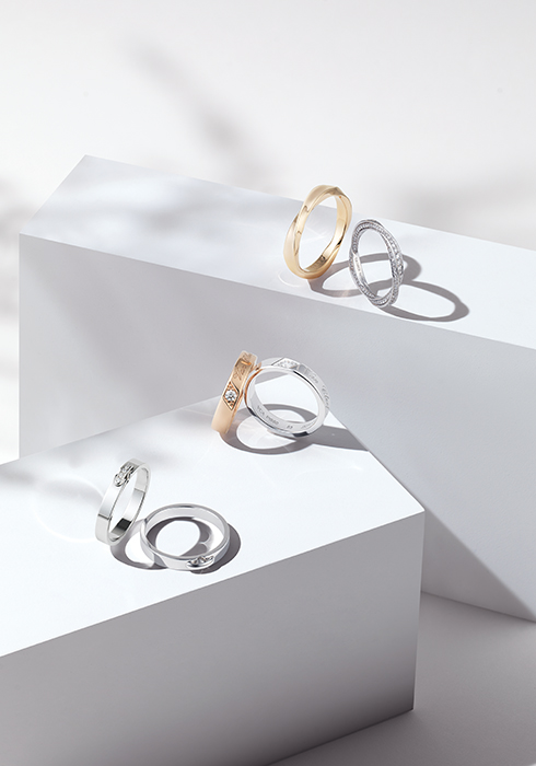 (위부터 차례대로) 트위스트 밴드 형태가 특징인 스파이럴 컬렉션 핑크 골드 웨딩 밴드 3백80만원, 다이아몬드를 섬세하게 세팅한 스파이럴 컬렉션 파베 다이아몬드 화이트 골드 웨딩 밴드 8백20만원 모두 그라프. 총 0.06캐럿의 다이아몬드를 세팅하고 로고 문구로 포인트를 준 로즈 골드 소재의 뚜쥬르 시그너처 에또왈 웨딩 밴드 2백만원대, 플래티넘 소재의 뚜쥬르 시그니처 에또왈 웨딩 밴드 4백만원대 모두 반클리프 아펠. 총 0.02캐럿의 5개 브릴리언트 컷 다이아몬드를 세팅한 리앙 에비당스 웨딩 밴드, 두께 3mm의 플래티넘 소재 리앙 에비당스 웨딩 밴드 각 3백만원대 모두 쇼메.