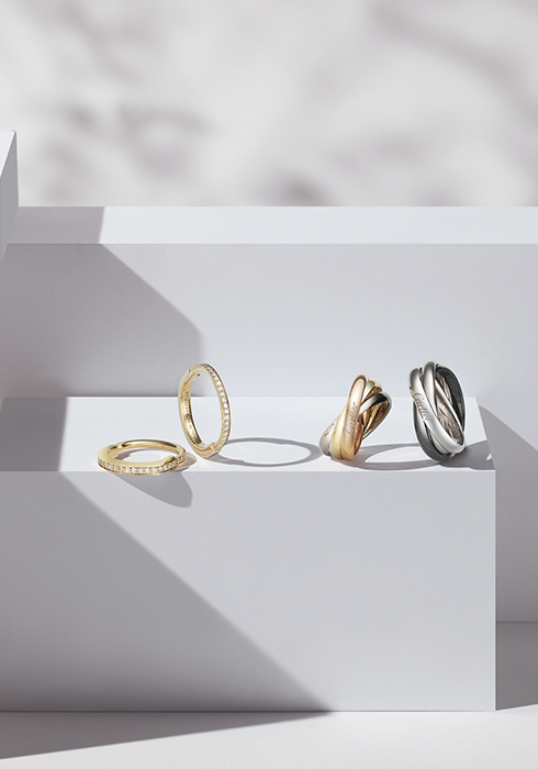 (왼쪽부터 차례대로) 메종의 시그너처 모티브인 자물쇠에서 영감받아 탄생했으며, 총 1.08캐럿의 브릴리언트 컷 다이아몬드를 세팅한 티파니 락 링, 총 0.15캐럿의 브릴리언트 컷 다이아몬드를 링의 반에만 세팅해 시크한 멋을 부여한 티파니 락 링 모두 가격 미정 티파니. 옐로·핑크·화이트 골드 소재 조합이 돋보이는 클래식 트리니티 링, 화이트 골드와 블랙 세라믹의 하모니가 도회적인 느낌을 선사하는 클래식 트리니티 링 각 2백만원대 모두 까르띠에.