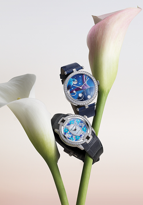 (위부터 차례대로) 38mm 18K 화이트 골드 케이스에 2백3개의 라운드 다이아몬드를 세팅했으며, 미학적인 에나멜로 다이얼을 완성해 화려한 멋이 돋보인다. 오토매틱 메캐니컬 무브먼트를 장착했으며, 60시간의 파워 리저브를 제공하는 레이디 아펠 데이 앤 나잇 오와조 드 파라디 가격 미정 반클리프 아펠. 다이아몬드를 세팅한 화이트 골드 소재의 36mm 케이스를 더하고, 다이얼에는 머더오브펄 바탕에 손으로 세공한 에나멜 꽃 장식 디테일이 돋보이는 벨벳 블로썸 MB 가격 미정 로저드뷔.