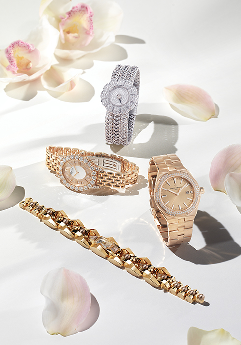 (위부터 차례대로) 총 12.36캐럿의 다이아몬드를 세팅해 화려한 자태를 뽐내는 화이트 골드 소재의 엘리오 가격 미정 부첼라티. 머더오브펄로 장식한 오벌 셰이프 다이얼에 1백23개 다이아몬드를 세팅했으며, 베젤과 러그를 38개 브릴리언트 컷 다이아몬드로 장식했다. 메종만의 장인 정신과 우아한 스타일을 드러내는 디아망트 컬렉션 1억4천2백21만원 쇼파드. 케이스부터 브레이슬릿까지 18K 5N 핑크 골드 소재로 완성하고, 베젤에 90개 라운드 컷 다이아몬드를 세팅했으며, 칼리버 1088/1로 구동하고 40시간의 파워 리저브를 자랑하는 오버시즈 셀프 와인딩 8천6백50만원 바쉐론 콘스탄틴. 바이올렛·옐로 골드로 완성한 브레이슬릿과 옐로 골드 케이스가 우아한 조화를 이루는 클래쉬 [언]리미티드 가격 미정 까르띠에.