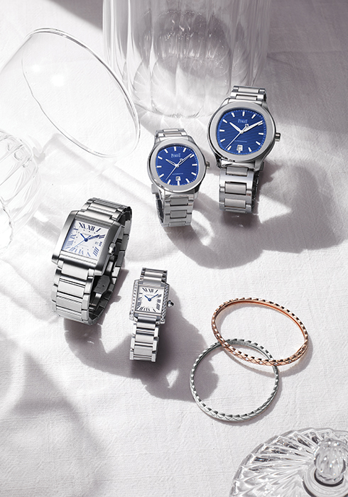 (위부터 차례대로) 메종의 아이코닉한 쿠션 라운드 형태의 42mm 스틸 케이스가 돋보이며 6시 방향에 날짜창이 위치한다. 자체 제작 1110P 기계식 셀프 와인딩 무브먼트로 구동하는 피아제 폴로 2천90만원, 36mm 스틸 케이스와 기요셰 장식의 블루 다이얼의 조합이 깨끗한 느낌을 부여하며, 약 0.07캐럿의 36개 브릴리언트 컷 다이아몬드로 인덱스를 장식한 피아제 폴로 데이트 2천1백20만원 모두 피아제. 단정한 느낌을 선사하는 스틸 케이스로 데일리로 착용하기 제격이며, 오토매틱 와인딩 메캐니컬 무브먼트를 장착한 라지 사이즈의 탱크 프랑세스 8백만원대, 브릴리언트 컷 다이아몬드를 세팅한 스틸 케이스와 검 모양 블루 스틸 핸즈가 눈길을 사로잡는 스몰 사이즈의 모델 탱크 프랑세스 1천1백만원대 모두 까르띠에. 18K 베이지 골드 소재에 총 0.32캐럿의 9개 브릴리언트 컷 다이아몬드를 세팅한 코코 크러쉬 브레이슬릿 1천3백만원대, 어디에나 레이어링하기 좋은 사이즈의 18K 화이트 골드 소재 코코 크러쉬 브레이슬릿 7백만원대 모두 샤넬 화인 주얼리.