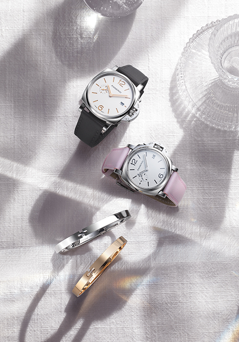 (위부터 차례대로) 42mm 폴리시드 스틸 케이스에 화이트 선 브러시드 다이얼로 완성했으며, 3시 방향에 날짜, 9시 방향에 스몰 세컨즈 인디케이터가 위치한다. P.900 칼리버를 탑재하고 무려 3일간의 파워 리저브를 자랑하는 루미노르 두에 프라다 리-나일론, 38mm 폴리시드 스틸 케이스와 핑크 나일론 스트랩의 조합이 사랑스러운 느낌을 자아내며, P.900 칼리버를 장착하고 오토매틱 무브먼트로 구동하는 루미노르 두에 각 9백만원대 모두 파네라이. 교감과 나눔을 상징하는 모티브가 특징인 폭 6mm의 화이트 골드 소재 리앙 에비당스 브레이슬릿, 총 0.03캐럿의 5개 브릴리언트 컷 다이아몬드를 세팅한 로즈 골드 소재의 리앙 에비당스 브레이슬릿 각 1천만원대 모두 쇼메.