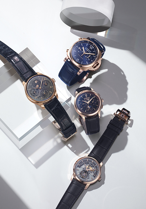 핀 버클과 딥 블루 컬러 악어가죽 스트랩의 조화가 메종만의 특별한 미적 감각을 선사한다. 44mm 케이스를 장착하고 P.9200 칼리버로 구동하는 루미노르 크로노 골드테크™ 블루 노트 3천만원대 파네라이. 44.2mm 18K 레드 골드 케이스를 더했으며, 다이얼에는 날짜, 요일, 월, 문페이즈, 파워 리저브 디스플레이가 위치한다. 더블 문페이즈 디스플레이로 실제 달의 주기와의 오차가 5백77.5년 동안 단 하루에 지나지 않는 기술력을 자랑하는 포르투기저 퍼페추얼 5천6백30만원 IWC. 40mm 케이스에 바깥쪽으로 경사진 베젤, 그리고 곡선형 러그의 실루엣이 절제된 세련미를 발산하는 동시에 선레이 브러싱 처리한 블랙 컬러 다이얼이 매력적이다. 오토매틱 칼리버 759를 장착한 마스터 컨트롤 크로노그래프 캘린더 4천7백만원 예거 르쿨트르. 칼리버 2162 R31을 탑재했으며,