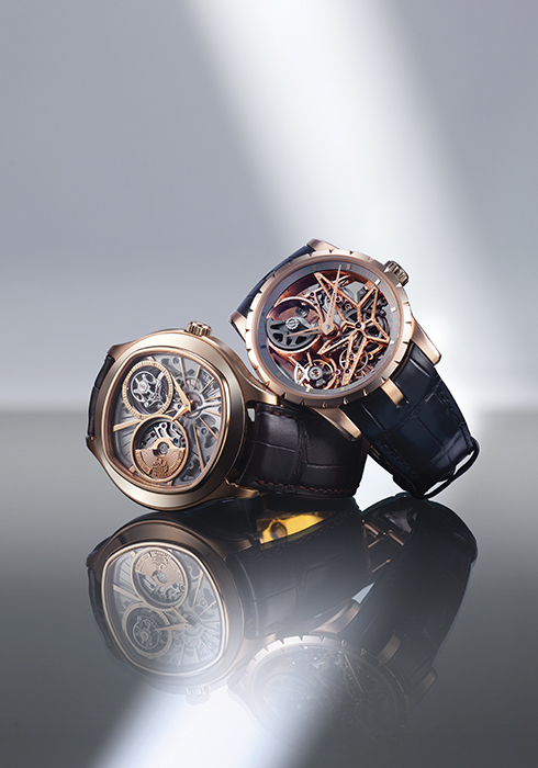 (왼쪽부터 차례대로) 메종 최초의 울트라-신 셀프 와인딩 투르비용 무브먼트를 장착해 기술적 가치가 돋보이는 워치. 18K 핑크 골드 소재 케이스가 고급스러움을 배가하며, 자체 제작 1270P 울트라-신 기계식 셀프 와인딩 투르비용 무브먼트로 구동하는 피아제 엠퍼라도 뚜르비옹 2억9천4백만원 피아제. 42mm 핑크 골드 케이스와 톱니형 베젤, 3개의 러그가 특징이며, 마이크로 로터를 더한 오토매틱 스켈레톤 무브먼트를 장착한 엑스칼리버 MB 가격 미정 로저드뷔.
