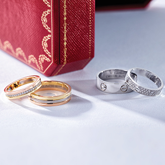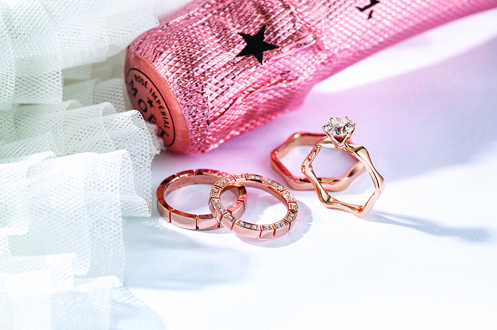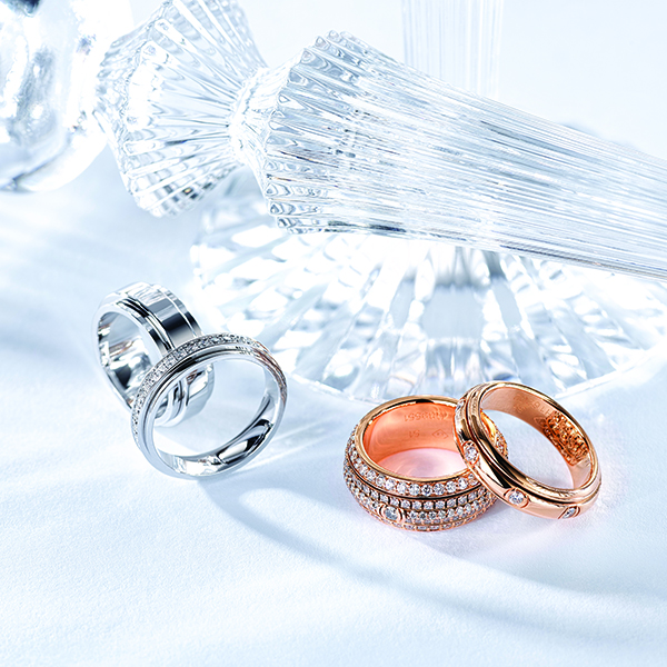 (첫 번째 줄 사진 왼쪽부터) 피아제 포제션 컬렉션 회전하는 2개의 링이 결합된, 영원한 사랑의 의미를 담은 커플 링. 화이트 골드 밴드 링 2백만원대, 다이아몬드 화이트 골드 밴드 링 7백만원대, 다이아몬드 파베 세팅 핑크 골드 링 1천8백만원대, 핑크 골드 밴드 링 3백만원대. (첫 번째 줄 가운데 사진 왼쪽부터) 까르띠에 트리니티 컬렉션 옐로 골드와 화이트 골드, 핑크 골드 등 세 가지 다른 컬러의 하모니로 이루어진 커플 링. 다이아몬드 밴드 링 5백50만원대, 남성 밴드 링 1백80만원대. 까르띠에 러브 컬렉션 예비부부들에게 가장 인기가 좋은 브랜드의 시그너처 모티브인 스크루 문양이 새겨진 러브 링. 화이트 골드 러브 링 2백10만원대, 다이아몬드 세팅 뉴 러브링 8백40만원대.