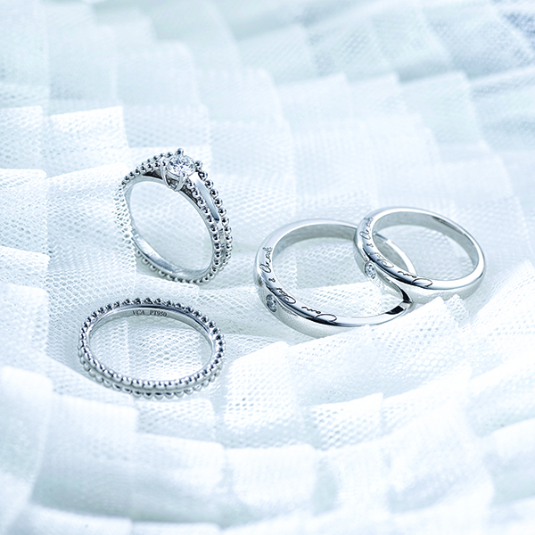 (두 번째 줄 가운데 사진 왼쪽부터) 반클리프 아펠 에스텔 컬렉션 장인이 직접 만든 정교한 비즈 장식을 밴드 양쪽에 섬세하게 세팅한 커플 링. 다이아몬드 세팅 링 0.3캐럿 기준 6백10만원대, 웨딩 밴드 링 3백20만원대. 반클리프 아펠 뉴욕 컬렉션 솔로 다이아몬드 세팅과 이탤릭체 로고 시그너처가 특징이다. 각 3백90만원대.