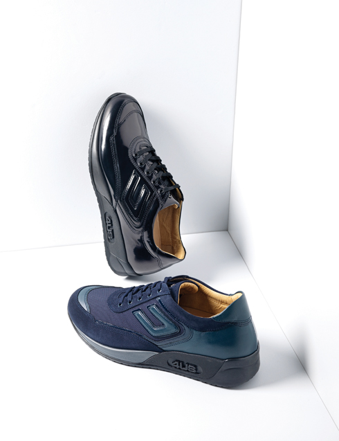 메탈 장식이 없는 보다 심플한 마라톤 컬렉션. 슈즈 안에 7cm에 달하는 히든 굽이 들어 있는 매력적인 디자인으로 캐주얼 수트나 클래식한 캐주얼 룩에 잘 어울린다. 파치오티는 수십 년간 이어온 전통 가공 기법과 노하우를 고집해서 전 제품을 ‘메이드 인 이탈리아’로 제작한다. 위쪽의 코팅된 소가죽인 블랙 복스 소재 슈즈는 48만원, 패브릭을 매치한 아래쪽의 네이비 컬러 슈즈는 38만원 모두 4US by 파치오티.
