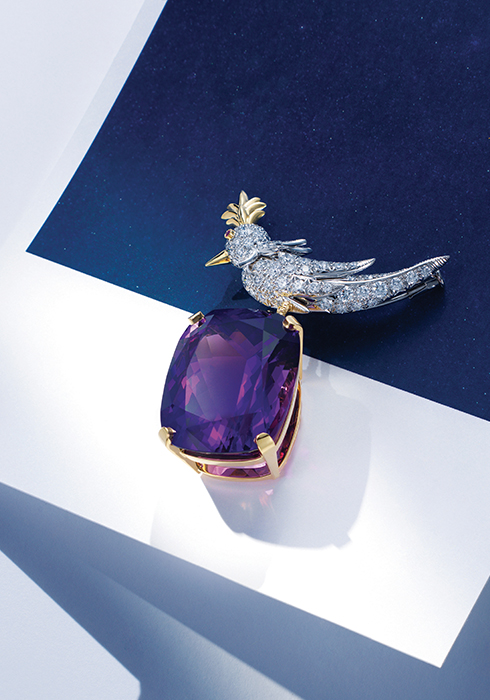 18K 옐로 골드와 플래티넘에 총 57캐럿의 쿠션 컷 자수정을 매치했으며, 몸 전체에는 총 2캐럿, 71개의 라운드 브릴리언트 다이아몬드를 파베 세팅하고, 가장 포인트가 되는 새의 눈동자에는 핑크 사파이어를 매치했다. |