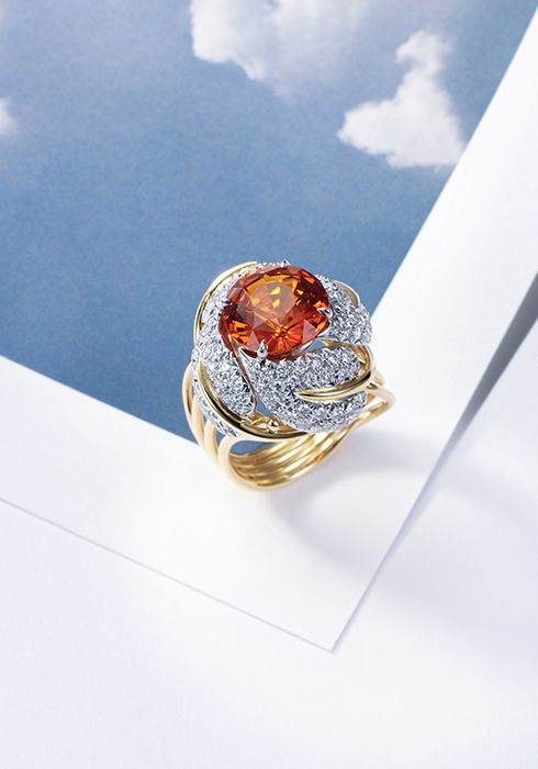 18K 옐로 골드와 플래티넘에 총 5캐럿 오렌지 사파이어를 센터 세팅하고 그 주위로 총 1캐럿, 1백4개의 라운드 브릴리언트 컷 다이아몬드를 세팅해 화려함과 특별함을 부여한 링.