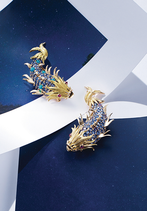 살아 움직이는 듯 생동감 넘치는 물고기를 형상화한 브로치. (위) 18K 옐로 골드에 총 6캐럿, 67개의 라운드 블루 사파이어를 세팅하고 총 0.69캐럿의 카보숑 컷 터키석 5개를 추가했다. 물고기의 눈은 총 0.17캐럿, 2개의 핑크 사파이어로 마무리했다. (아래) 총 7캐럿, 69개의 라운드 블루 사파이어와 총 0.62캐럿, 5개의 라운드 퍼플 사파이어를 세팅하고, 마찬가지로 라운드 핑크 사파이어로 눈을 완성했다.