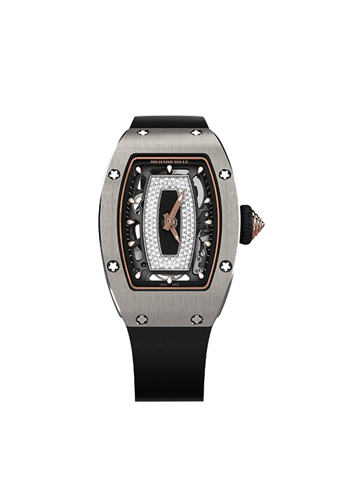 리차드 밀의 시그너처가 된 토노(tonneau) 형태의 워치 케이스에 여성들이 열광할 것이라고는 시계 전문가들도 쉽게 상상하지 못했다. 본래 편안한 착용감과 독창성을 위해 리차드 밀이 고집한 디자인으로, 정교한 각도로 완성해야 하기에 엄격한 기준하에 제작된다. 지금 리차드 밀을 사랑하는 많은 여성들이 이 케이스를 가장 큰 매력으로 꼽고 있으니 독특한 매력의 가치를 확인할 수 있다. 탄탄한 볼륨이 느껴지는 케이스 디자인, 정밀하게 고안한 스크루의 리드미컬한 배치, 브랜드 고유의 정교한 기술력과 우아함, 기계식 시계와 강렬한 디자인의 조화까지 최상의 가치를 담고 있다. 보석 세팅을 접목해 보다 아름다운 자태로 완성한 RM 07-01 레이디스 워치는 시간과 분을 표기하는 심플한 디자인이지만 50시간 파워 리저브 기능을 갖춘 완성도 높은 기계식 워치다. 다이얼 중심에 패턴을 넣어, 시각적으로 인상적이다. 사용자를 위한 직관적인 디자인을 한다는 것도 리차드 밀이 여성들에게 인기가 높은 이유 중 하나다. 그레이드 5 티타늄 베이스 플레이트와 브리지는 견고함에 있어서 타의 추종을 불허하고, 신기술인 가변 지오메트리 로터는 착용하는 사람의 활동 수준에 맞게 와인딩의 정도가 조절된다. 이 워치의 무브먼트인 CRMA2 칼리버에도 이 로터가 장착되어 있어 시계의 완성도를 높였다. 또 충격이 가해졌을 때 관성의 변화를 흡수할 수 있는 프리 스프링 밸런스와 새롭게 개발한 기어 톱니까지 더해 더욱 견고함 매력을 느낄 수 있다. 케이스는 견고한 ATZ 세라믹, TZP-Z 갈색 세라믹, 케이스 밴드는 레드 골드, 혹은 화이트 골드 및 다양한 보석 세팅이 된 밴드 중 선택할 수 있다.