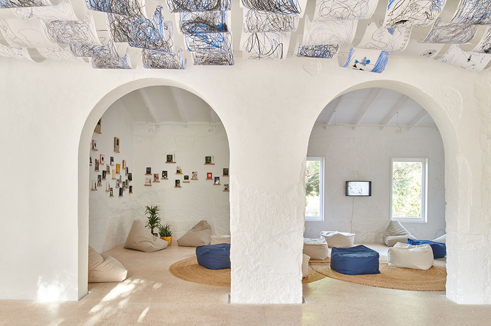 4 하우저앤워스 메노르카 내에 있는 ‘에듀케이션 랩’. 지역의 학생들과 예술에 관심 있는 이들이 다양한 학습을 할 수 있는 플랫폼이다. 드로잉 워크숍에서 지역 주민들이 그린 그림들이 천장에 걸려 있다. ※ 1~4 Photo by Daniel Scha··fer