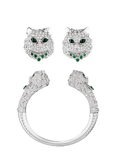 1858년부터 제작된 부쉐론의 애니멀 제품은 메종의 상징인 동시에 고귀한 자연을 재창조하는 컬렉션이다. 단순한 디자인이 아닌 각 동물들이 지닌 의미가 착용자와 강하게 연결되어 특별한 벗이자 부적이 되어준다. 이번에 새롭게 출시된 블라디미르 르 샤 클립 이어링은 다이아몬드를 파베 세팅한 화이트 골드 소재의 털 디테일, 짙은 그린 컬러의 눈, 반짝이는 차보라이트 네크리스를 착용한 고양이 블라디미르가 귀여움을 자아내는 스터드 이어링이다. 총 1.32캐럿의 2백12개 라운드 다이아몬드와 총 0.12캐럿의 10개 차보라이트를 세팅한 18K 화이트 골드로 제작했다. 또 블라디미르 르 샤 브레이슬릿은 양쪽에 강렬한 그린 컬러의 눈이 돋보이는 화려한 고양이 두 마리가 눈길을 끈다. 화이트 골드 및 다이아몬드로 표현한 털 디테일과 차보라이트 네크리스가 우아하게 어우러져 눈부신 스타일을 연출한다. 총 12.8캐럿의 1천1백88개 라운드 다이아몬드와 0.4캐럿의 16개 차보라이트, 0.26캐럿의 2개 페어 컷 차보라이트를 세팅했다. 문의 02-3467-8334