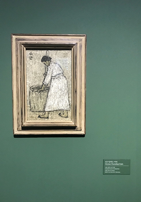 2 박수근 회고전은 4부로 구성되어 있는데, 1부 ‘밀레를 사랑한 소년’, 2부 ‘미군과 전람회’, 3부 ‘창신동 사람들’, 4부 ‘봄을 기다리는 나목’ 순이다. 사진은 1부의 전시 작품 중 박수근의 ‘절구질하는 여인’(1956). 캔버스에 유채, 국립현대미술관 이건희컬렉션.