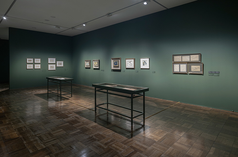 5 박수근의 독학 행보를 살펴볼 수 있는 1부의 전시 풍경. 가세가 기울면서 보통학교만 졸업하고 독학으로 미술을 공부한 박수근은 서양화집, 신문에 소개된 그림, 풍물 엽서 등 다양한 자료를 활용해 습작에 열중했다.